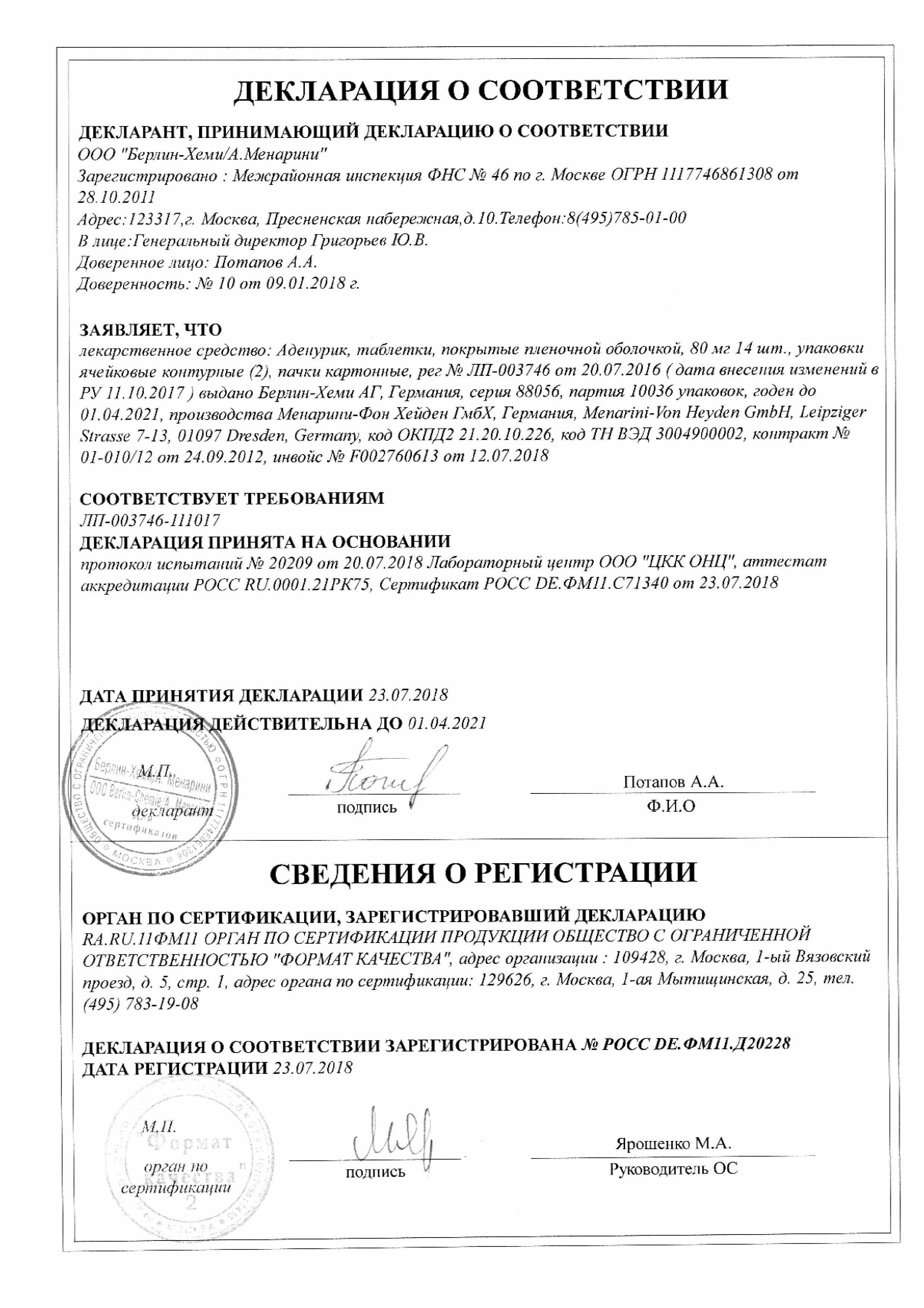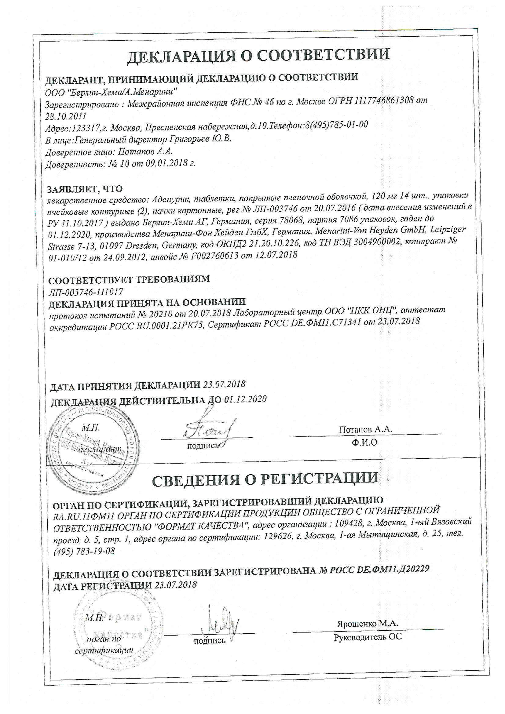 Сертификаты Аденурик