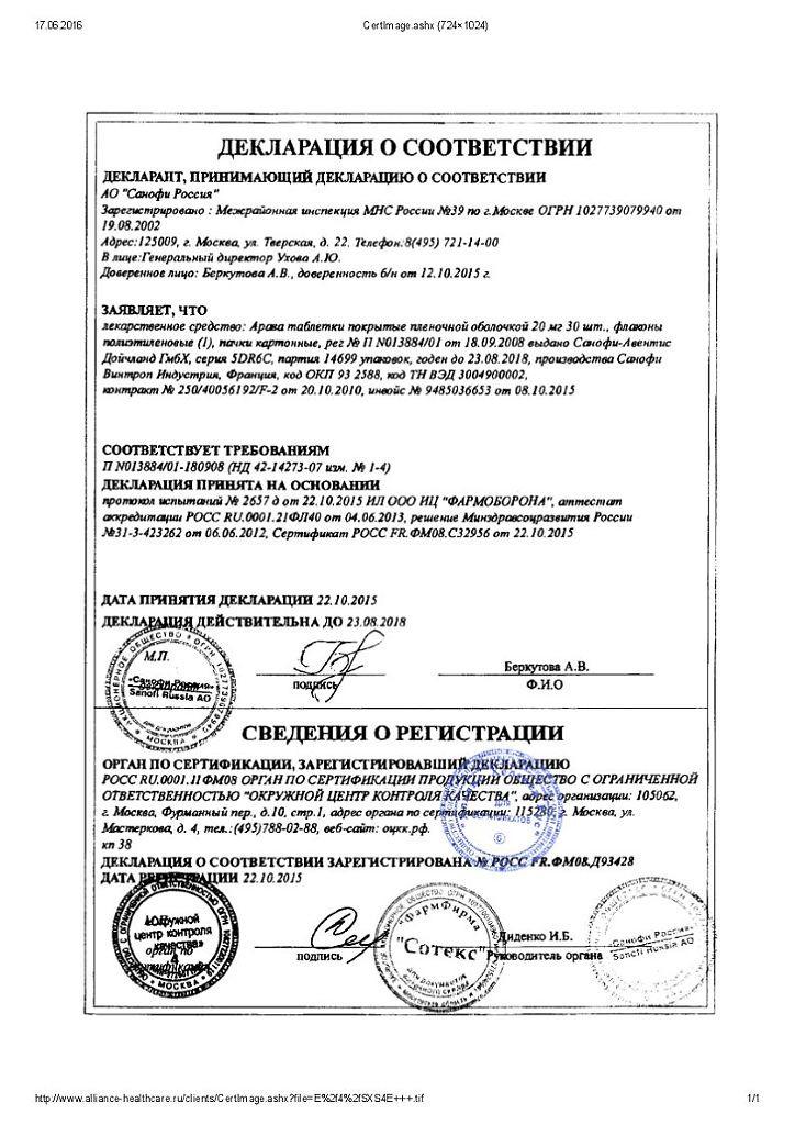1 таблетка Арава содержит лефлуномида 0,02 г.