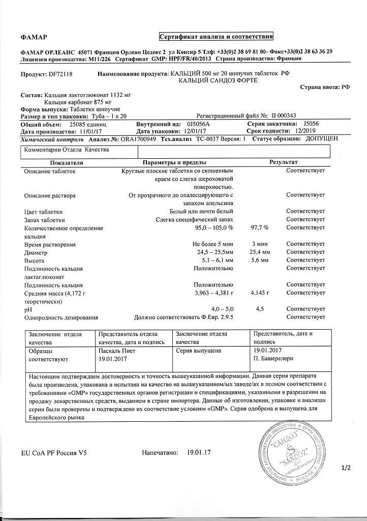 Активный компонент: кальция лактат глюконат (2,94 г), кальция карбонат (300 мг), что соответствует Са2+ (500 мг).