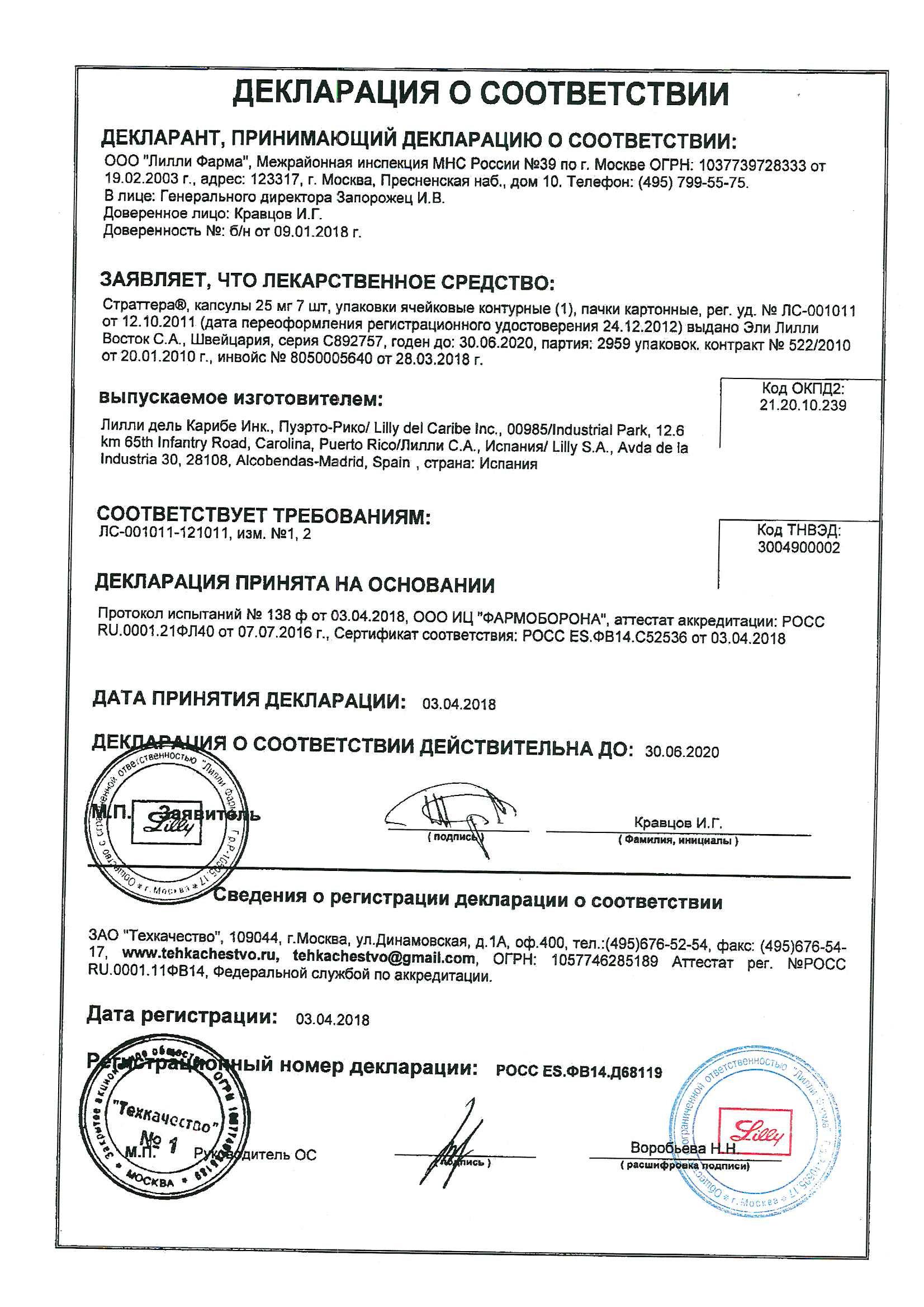 Назначение Страттеры с препаратами, удлиняющими интервал QT (карбонат лития, трициклические антидепрессанты, эритромицин, нейролептики, моксифлоксацин), веществами, изменяющими водно-электролитный баланс, блокаторами CYP2D6 повышает риск желудочковых аритмий.