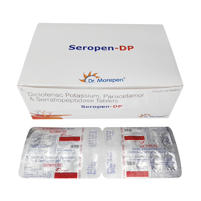 1 таблетка содержит парацетамола 500 мг, диклофенака калия 50 мг, серратиопептидазы в виде гранул с кишечнорастворимым покрытием, которые содержат 15 мг серратиопептидазы, что эквивалентно ферментной активности 30 000 ЕД на 1 таблетку.