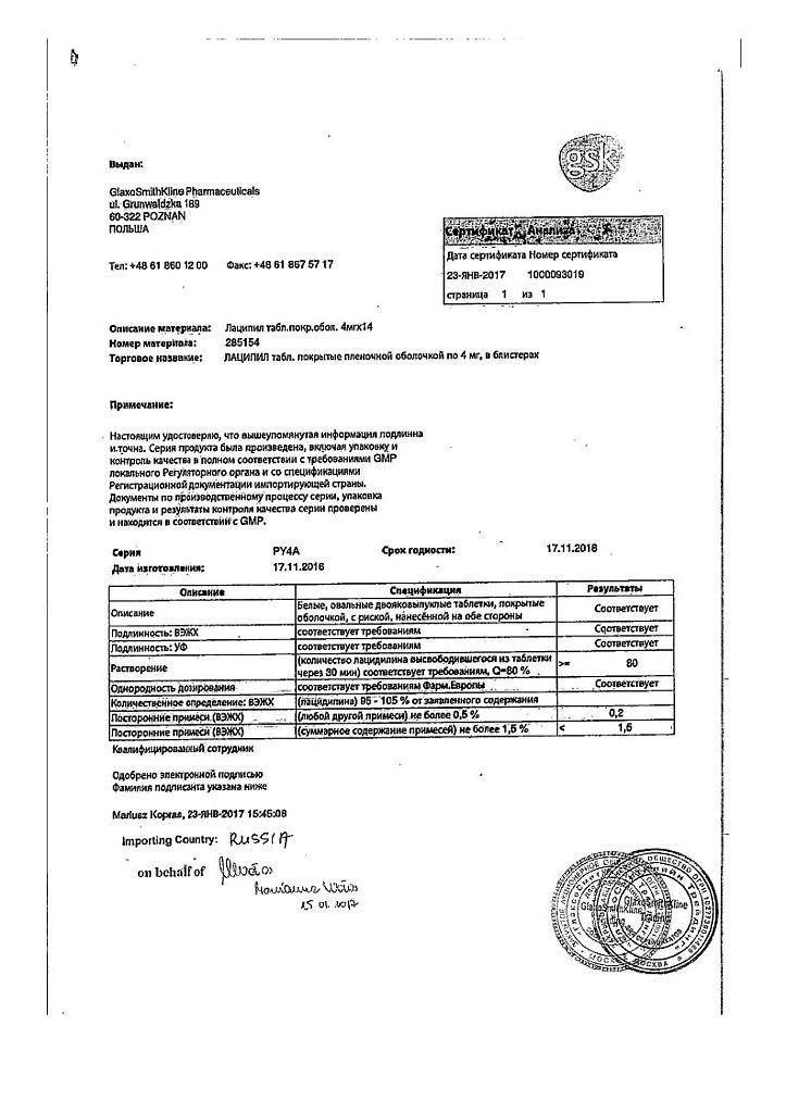 Активное вещество: лацидипин 4 мг.